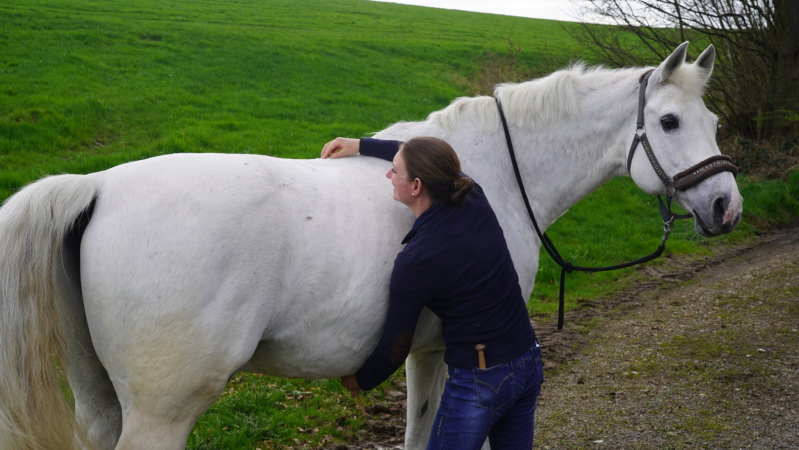 Eine Massage der auffälligen und verspannten Muskeln hilft, die Blockaden zu lösen und unterstützt das Pferd locker zubleiben und einen größeren Bewegungsrahmen zu erlangen.